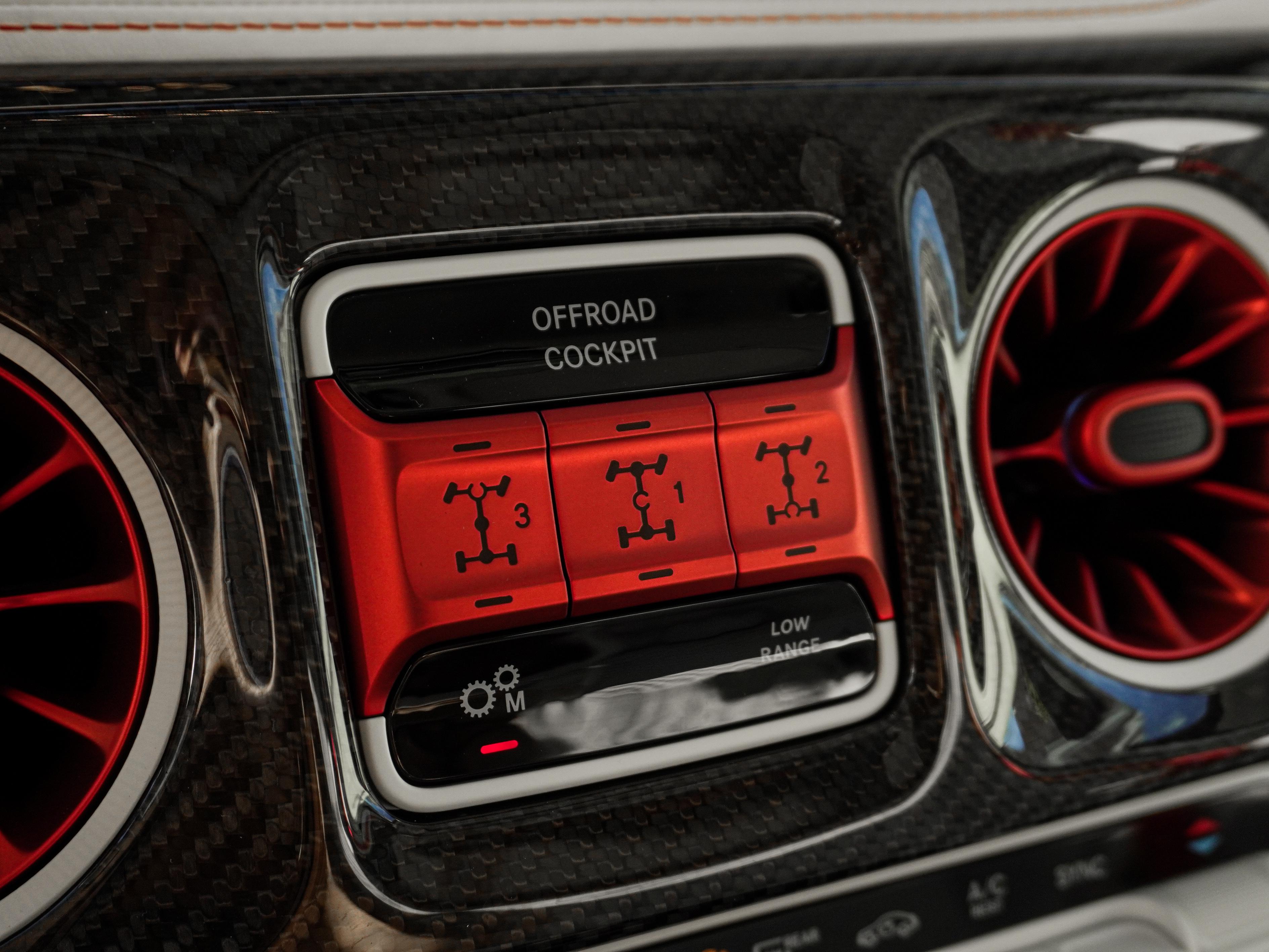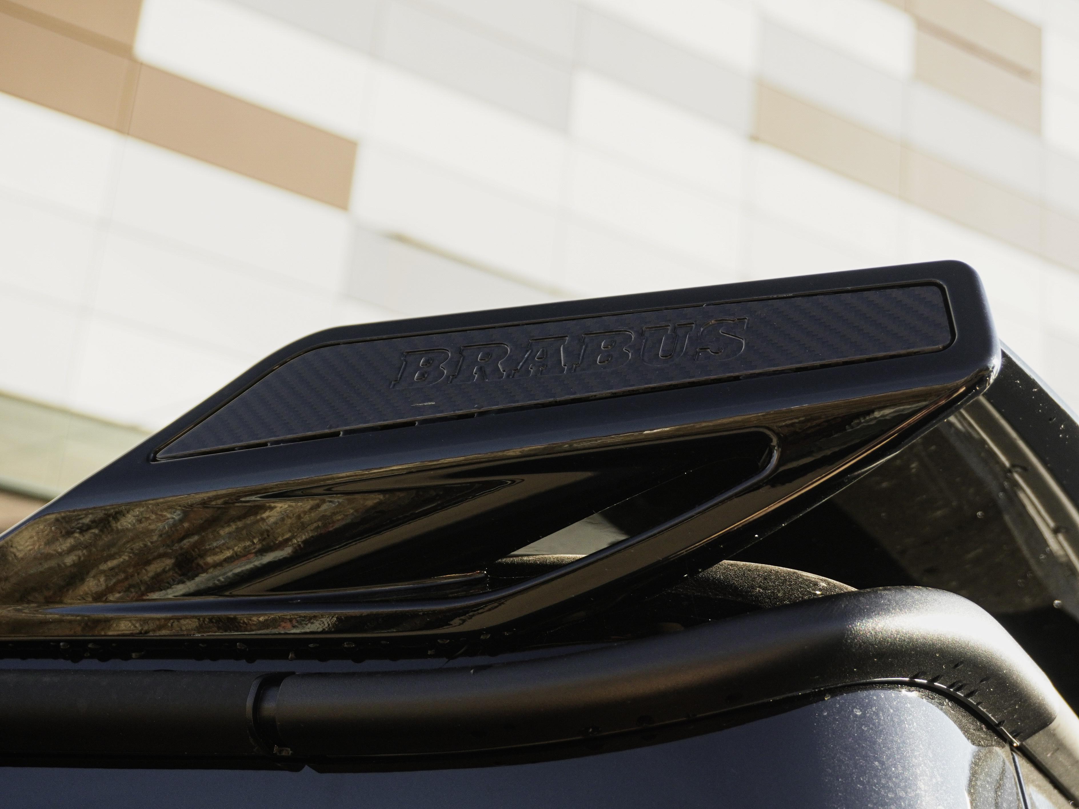 Экстерьер: Глубокий черный цвет кузова (Obsidian Black) подчеркивает атлетичные линии аэродинамического обвеса Widestar. Углепластиковый капот с дополнительными воздухозаборниками, карбоновая накладка на крышу с LED-прожекторами и фирменные эмблемы Brabus с подсветкой создают узнаваемый и устрашающий облик в зеркале заднего вида.