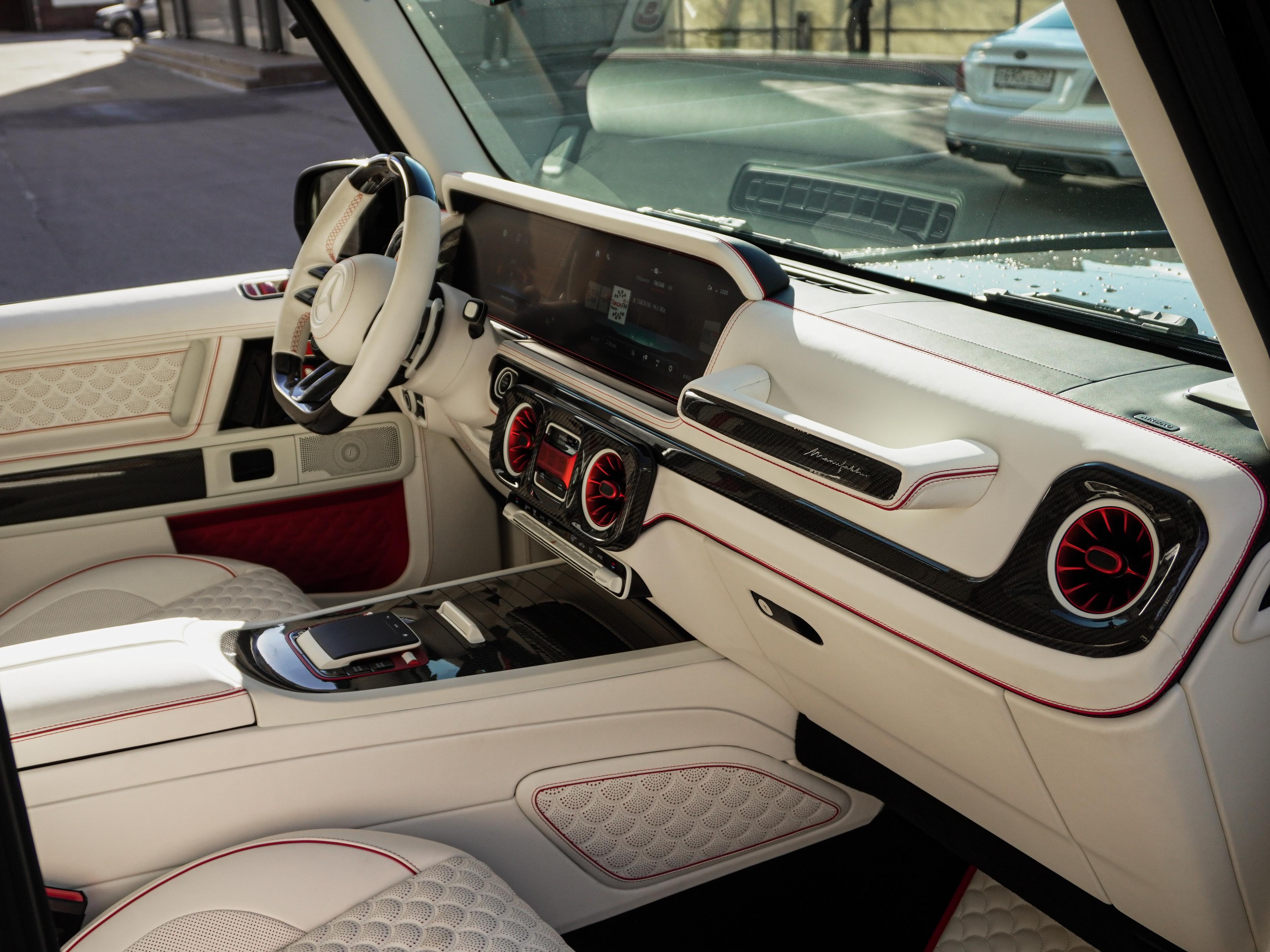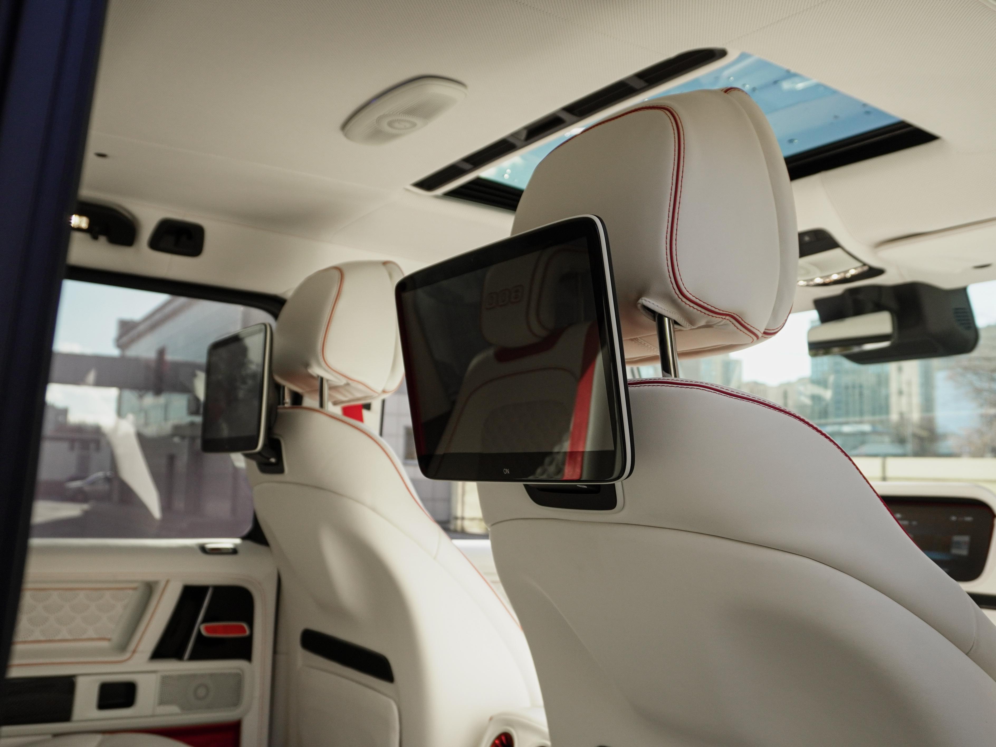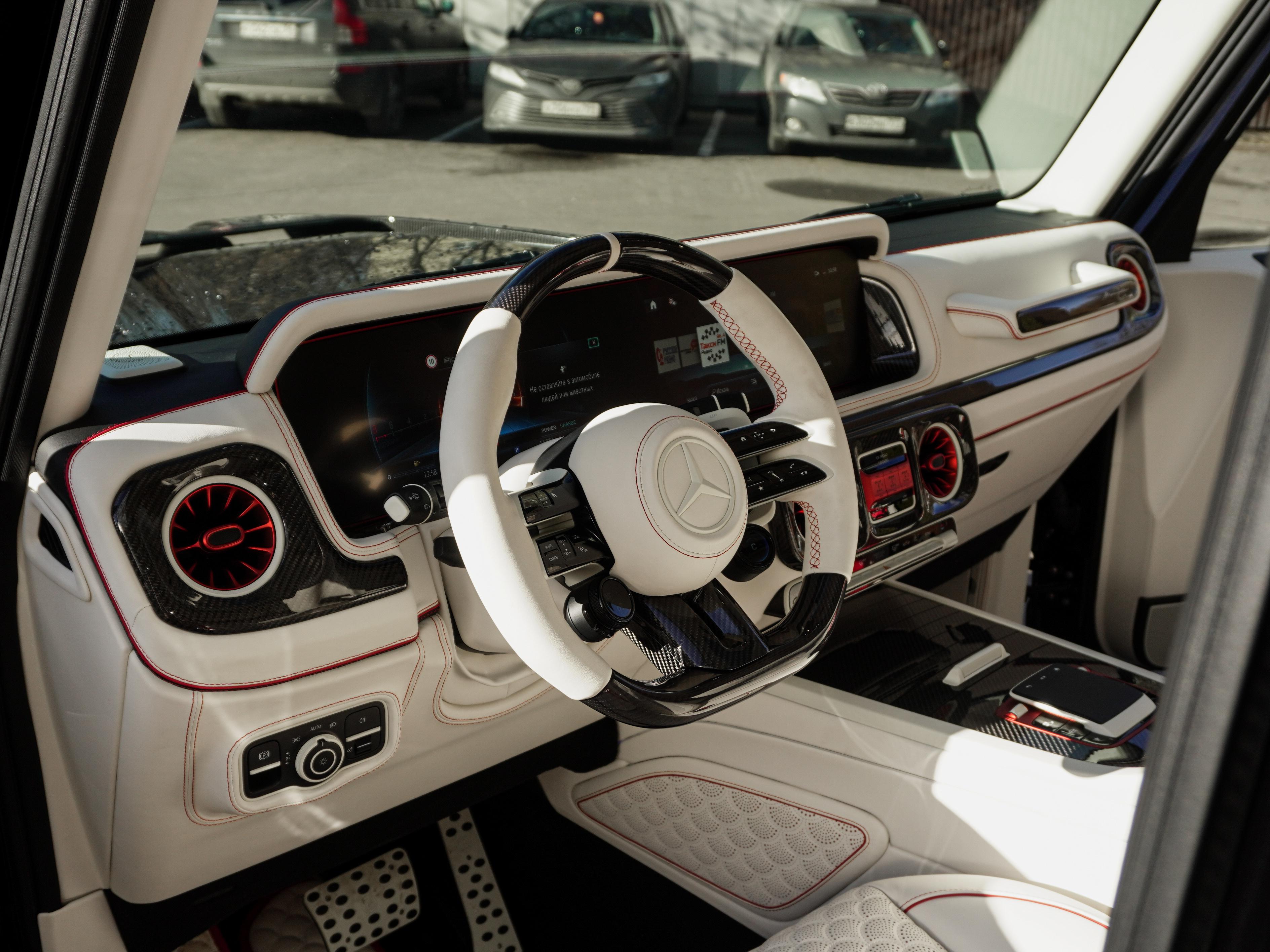 Интерьер: Внутри вас встречает роскошный контраст — салон, выполненный из нежнейшей кожи в цвете Porcelain/Beige. Мастера Brabus продумали каждую деталь: от перфорации сидений до эксклюзивных ковриков. Бежевый интерьер визуально расширяет пространство, создавая атмосферу частного бизнес-джета, а вставки из темного дерева или карбона завершают этот премиальный образ.